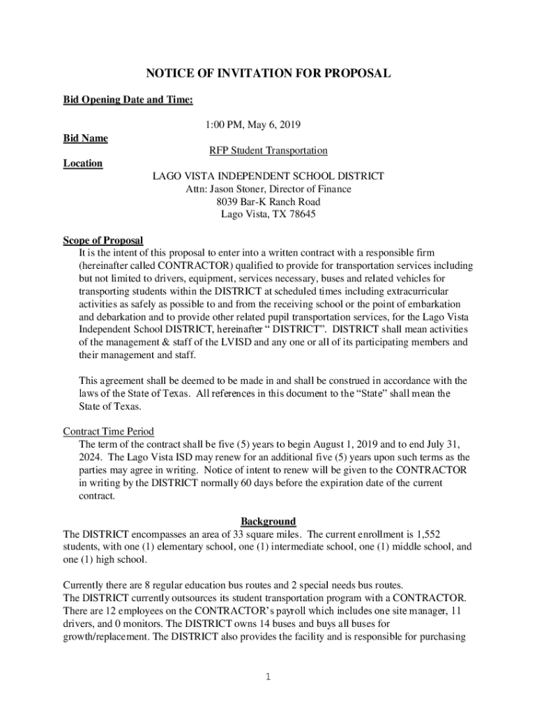 NOTICE OF INVITATION FOR PROPOSAL Bid Opening Date and Time: 1:00 PM, May 6, 2019, Bid Name RFP Student Transportation Location AGO VISTA INDEPENDENT SCHOOL DISTRICT Attn: Jason Stoner, Director of
