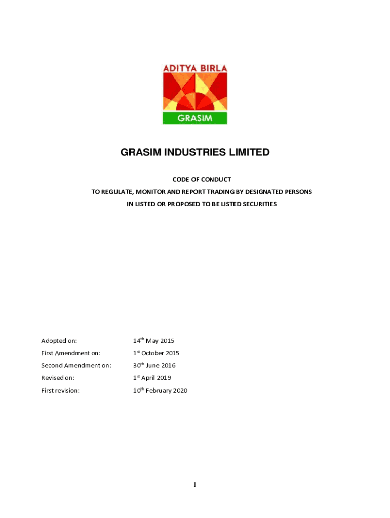 GRA SIM INDUSTRIES LIMITED CODE OF CONDUCT TO REGULATE, MONITOR AND REPORT TRADING BY DESIGNATED PERSONS IN LISTED OR PROPOSED TO BE LISTED SECURITIESAdopted on:14th May 2015First Amendment on:1st