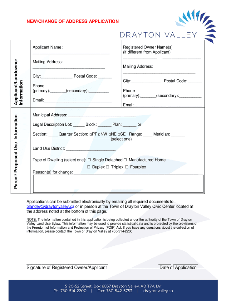 NEW/CHANGE OF ADDRESS APPLICATIONApplicant/Landowner InformationRegistered Owner Name(s) (if different from Applicant) ___ ___Mailing Address: ___Parcel/ Proposed Use InformationApplicant Name: ___Municipal
