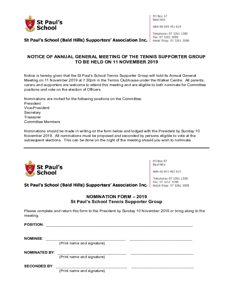 NOTICE OF ANNUAL GENERAL MEETING OF THE TENNIS SUPPORTER GROUP TO BE HELD ON 11 NOVEMBER 2019 Notice is hereby given that the St Paul's School Tennis Supporter Group will hold its Annual General Meeting