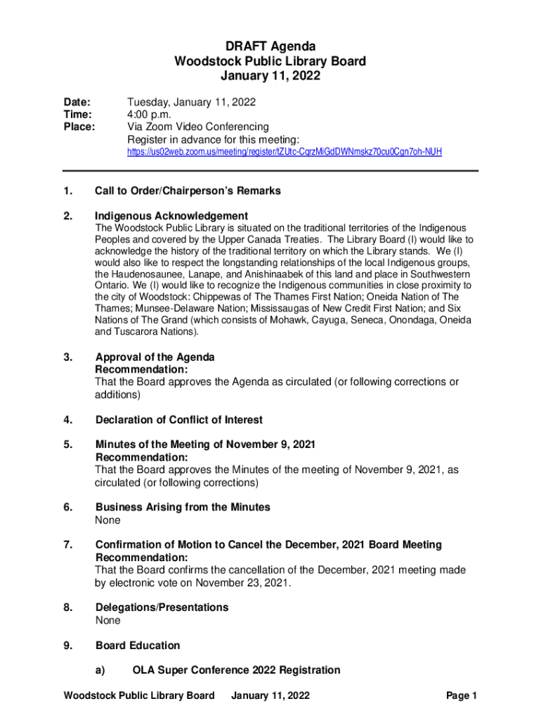 DRAFT Agenda Woodstock Public Library Board January 11, 2022, Date: Time: Place:Tuesday, January 11, 2022 4:00 p.m. Via Zoom Video Conferencing Register in advance for this meeting:https://us02web.zoom.us/meeting/register/tZUtcCqrzMiGdDWNmskz70cu0Cgn7ohNUH1.