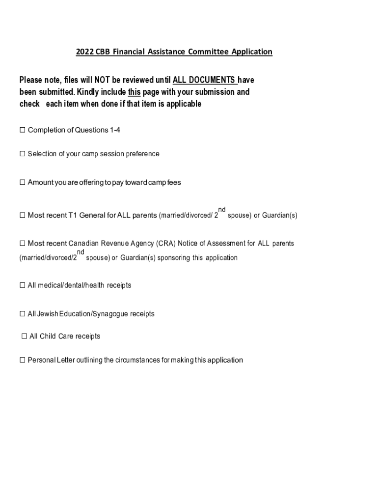 2022 CBB Financial Assistance Committee Application Please note, files will NOT be reviewed until ALL DOCUMENTS have been submitted. Kindly include this page with your submission and check each item