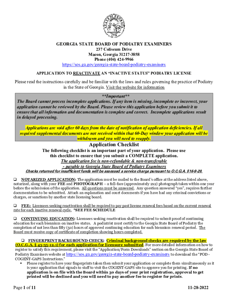 GEORGIA STATE BOARD OF PODIATRY EXAMINERS 237 Coliseum Drive Macon, Georgia 312173858 Phone (404) 4249966 https://sos.ga.gov/georgiastateboardpodiatryexaminers APPLICATION TO REACTIVATE AN INACTIVE
