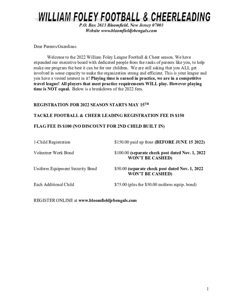 P.O. Box 2613 Bloomfield, New Jersey 07003 Website www.bloomfieldjrbengals.com Dear Parents/Guardians Welcome to the 2022 William Foley League Football & Cheer season. We have expanded our executive