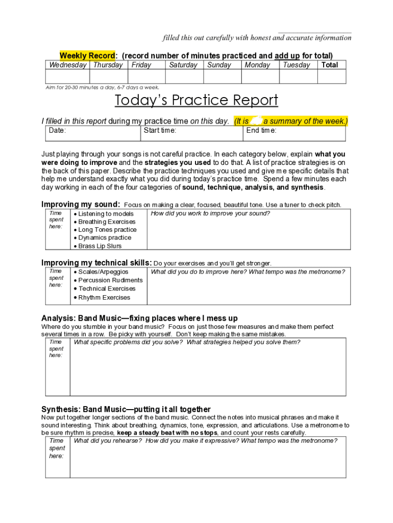 ___ filled this out carefully with honest and accurate information Weekly Record: (record number of minutes practiced and add up for total) Wednesday ThursdayFridaySaturdaySundayMondayTuesdayTotalAim