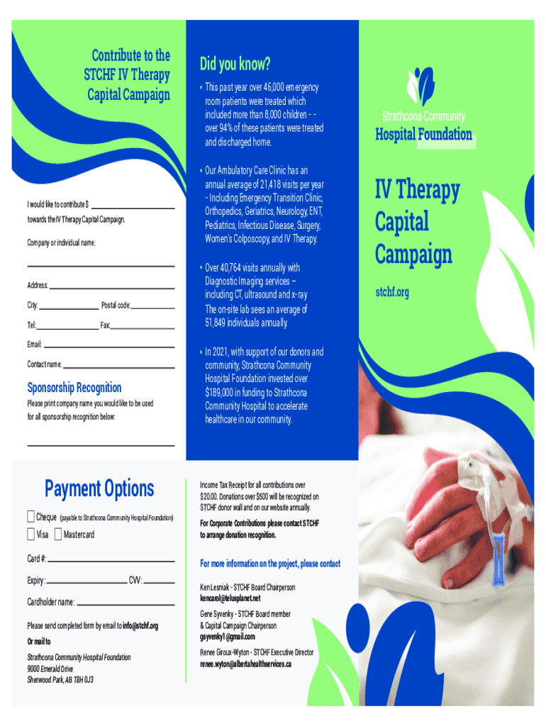 Contribute to the ST CHF IV Therapy Capital Campaign towards the IV Therapy Capital Campaign. Company or individual name:Address: City:Postal code:Tel:Fax:Email: Contact name:Sponsorship Recognition