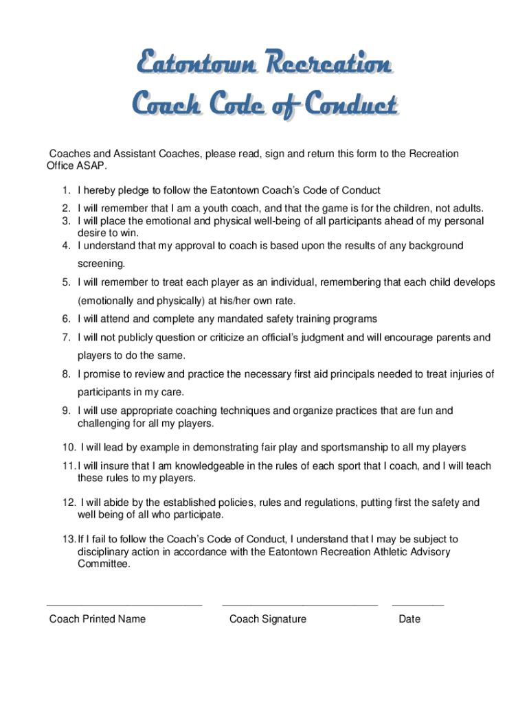 Coaches and Assistant Coaches, please read, sign and return this form to the Recreation Office ASAP. 1. I hereby pledge to follow the Eaton town Coach Code of Conduct 2. I will remember that I am