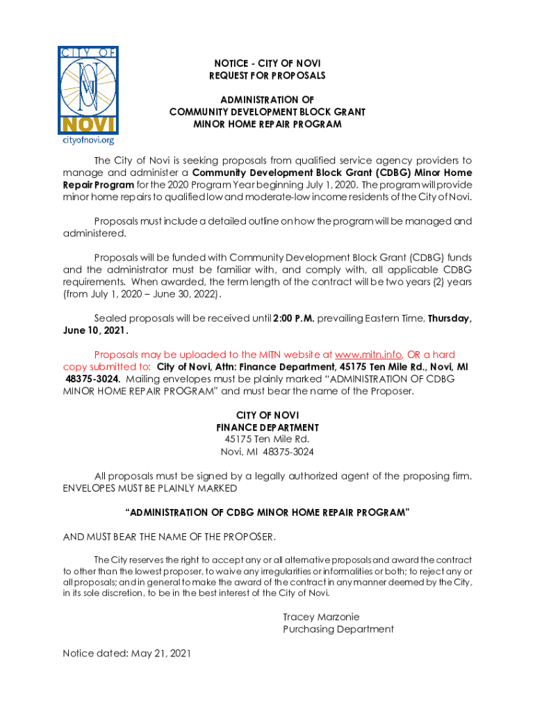 NOTICE CITY OF NOVA REQUEST FOR PROPOSALS ADMINISTRATION OF COMMUNITY DEVELOPMENT BLOCK GRANT MINOR HOME REPAIR PROGRAM The City of Nova is seeking proposals from qualified service agency providers