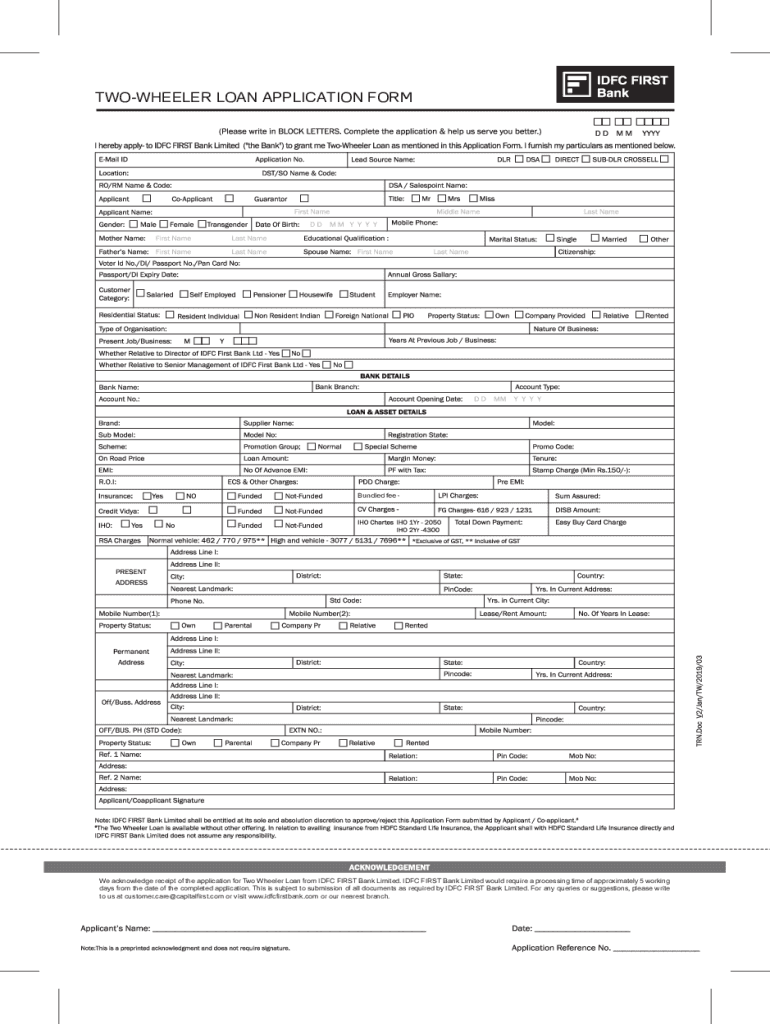 WHEELER LOAN APPLICATION Rebundled fee We acknowledge receipt of the application for Two Wheeler Loan from IDF FIRST Bank Limited. IDF FIRST Bank Limited would require a processing time of approximately