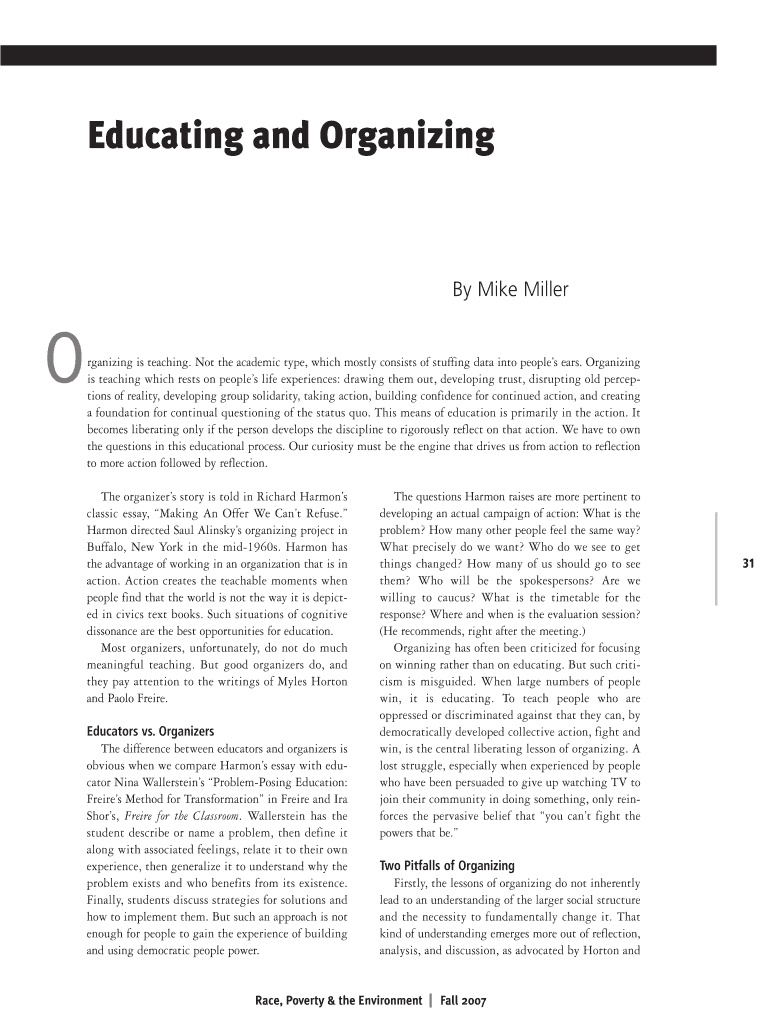 Educating and Organizing By Mike Miller Organizing is teaching. Not the academic type, which mostly consists of stuffing data into people s ears. Organizing is teaching which rests on people s life