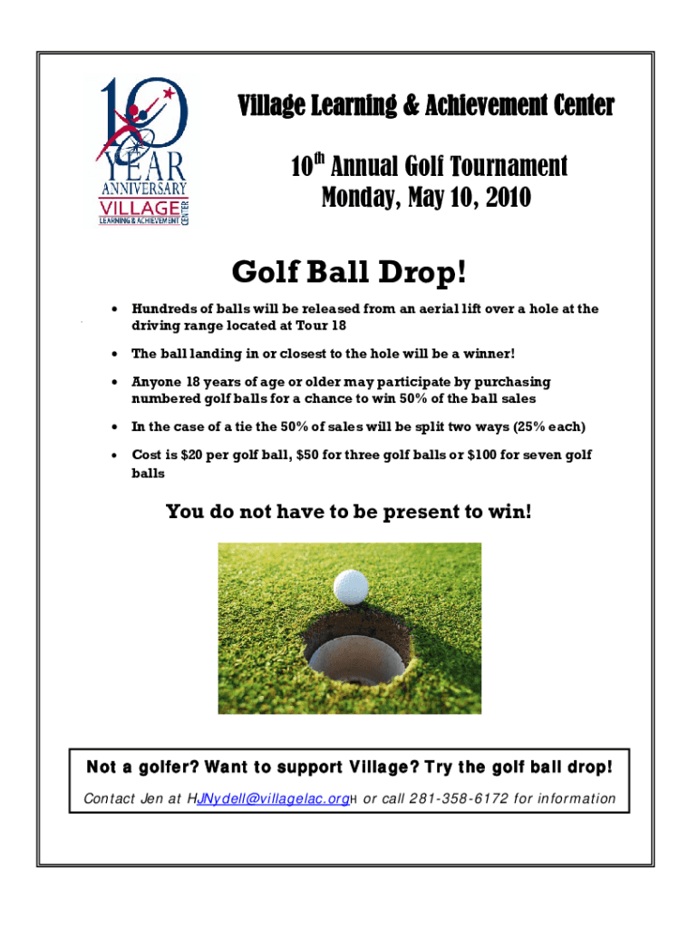 Village Learning & Achievement Center 10th Annual Golf Tournament Monday, May 10, 2010, Golf Ball Drop! Fundraising Hundreds of balls will50/50 be released prominent an aerial lift over a hole at
