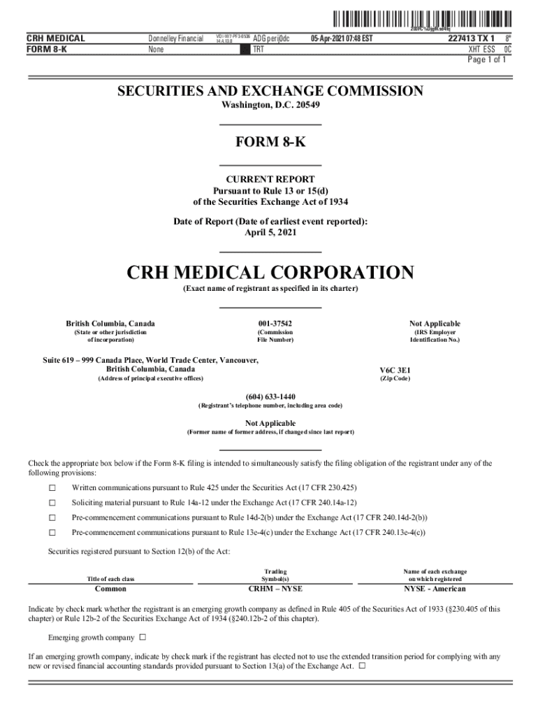200FC%DjgfKsd4fq 200FC%DjgfKsd4fqCRH MEDICAL FORM 8KDonnelley Financial NoneVDIW7PF30536 14.4.13.0ADG perij0dc TRT05Apr2021 07:48 EST227413 TX 1 8* AHT ESS 0C Page 1 of 1SECURITIES AND EXCHANGE COMMISSION