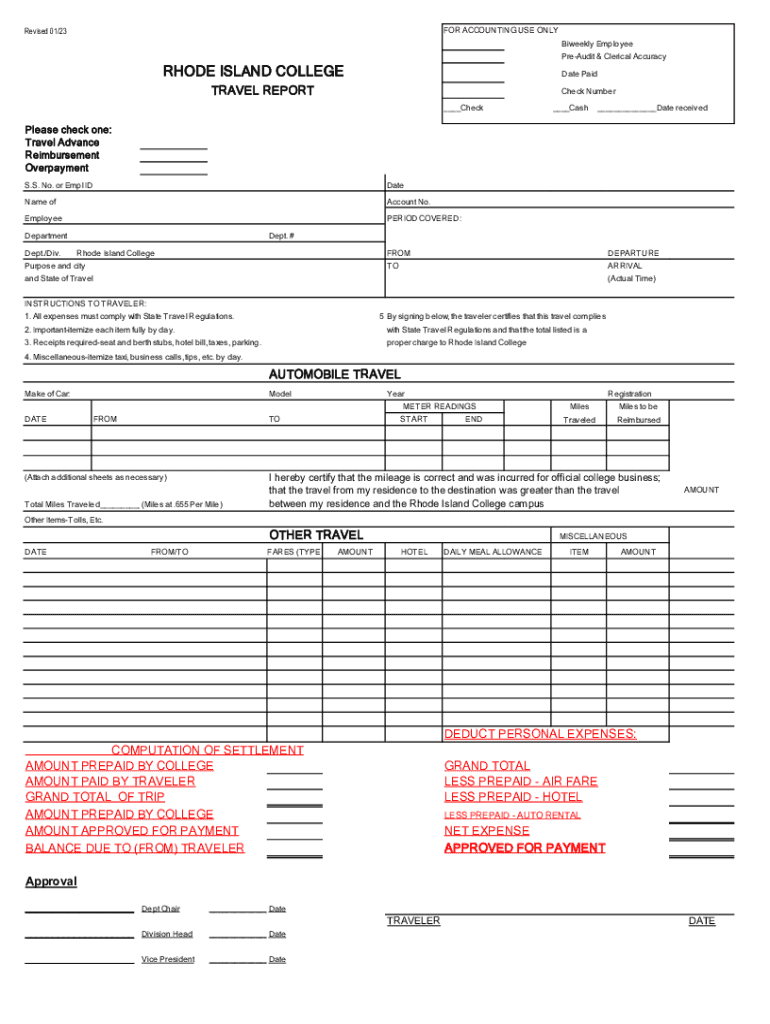 Revised 01/23FOR ACCOUNTING USE ONLY Biweekly Employee PreAudit & Clerical AccuracyRHODE ISLAND Collegiate Pre-travel REPORTCheck Number ___Check___Cash___Date receivedPlease check one: Travel Advance