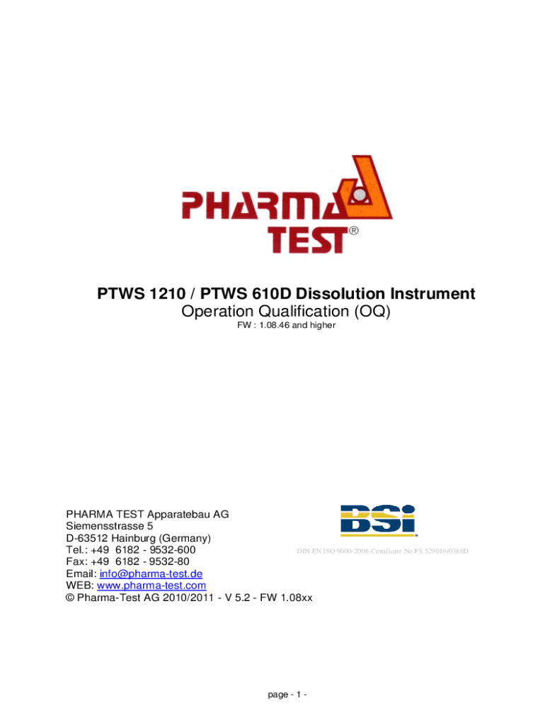 PAWS 1210 / PAWS 610D Dissolution Instrument Operation Qualification (OF) FW : 1.08.46 and higherPHARMA TEST Apparatebau AG Siemensstrasse 5 D63512 Hamburg (Germany) DIN EN ISO 90002008Certificate