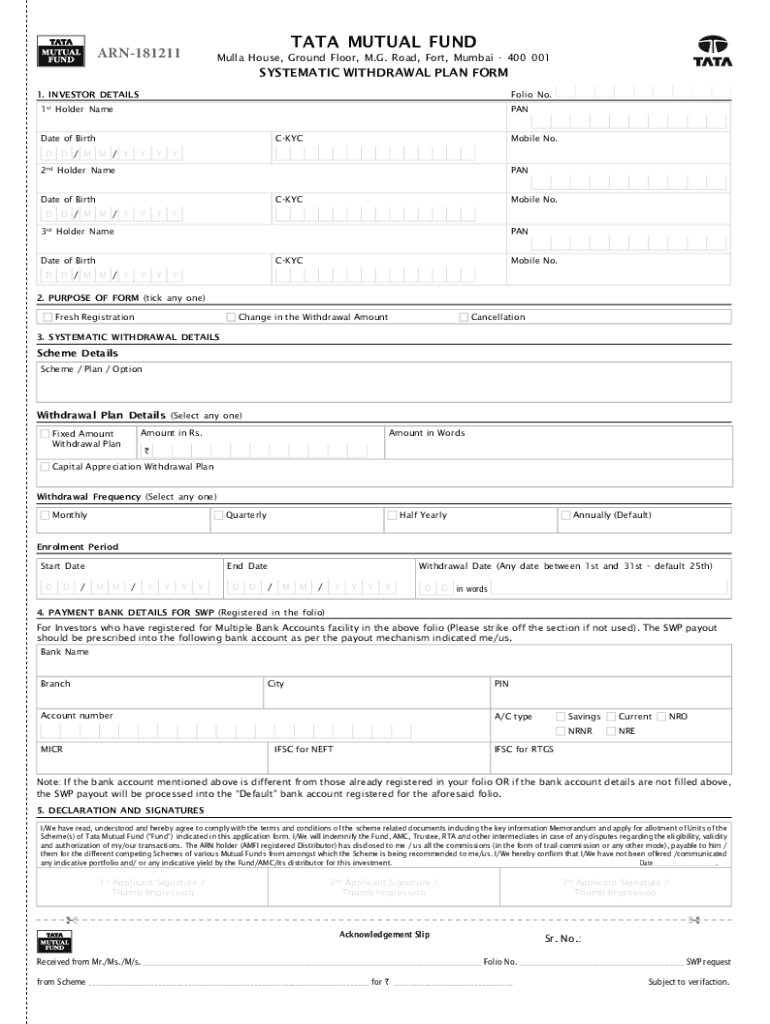 TATA MUTUAL FUNDARN181211Mulla House, First Floor, M.G. Road, Fort, Mumbai 400 001Systematic withdrawal plan Form 1. INVESTOR DETAILSFolio No.1 Holder NamePANstDate of BirthCKYCd d / m / mobile No.y2nd