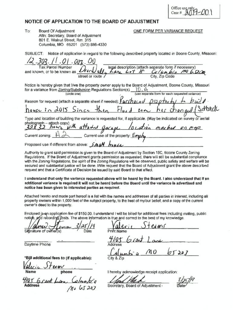 NOTICE OF APPLICATION TO THE BOARD OF ADJUSTMENT Board Of Adjustment Attn: Secretary, Board of Adjustment 801 E. Walnut Street, Rm. 315 Columbia, MO 65201 (573) 8864330To:ONE FORM PER VARIANCE REQUESTNotice