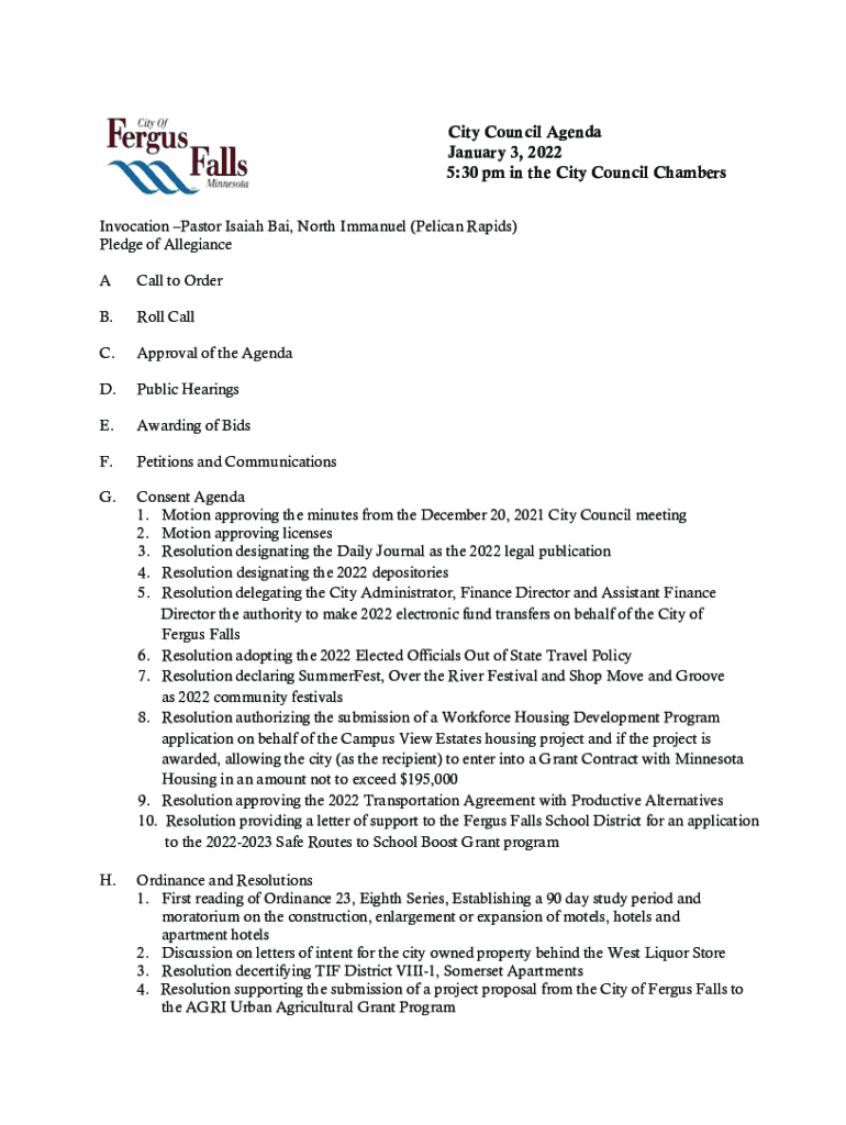 City Council Agenda January 3, 2022 5:30 pm in the City Council Chambers Invocation Pastor Isaiah Bad, North Immanuel (Pelican Rapids) Pledge of Allegiance Call to Order. Roll Call. Approval of the