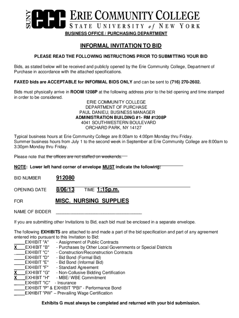 BUSINESS OFFICE / PURCHASING DEPARTMENTINFORMAL INVITATION TO BID PLEASE READ THE FOLLOWING INSTRUCTIONS PRIOR TO SUBMITTING YOUR BID Bids, as stated below will be received and publicly opened by