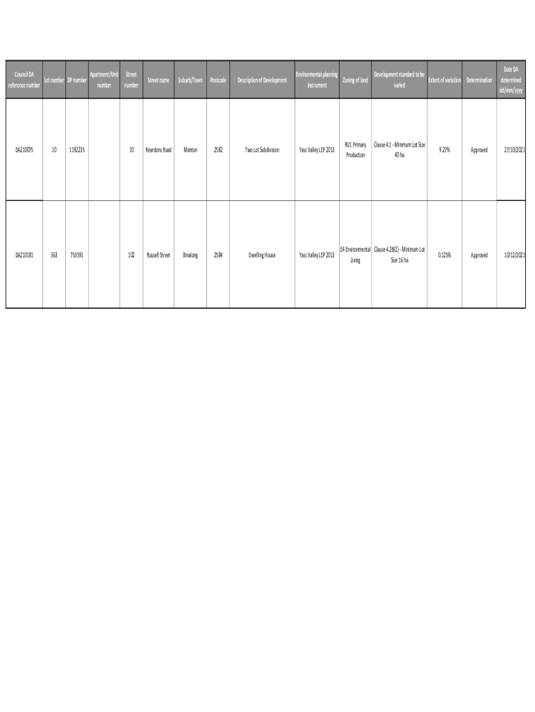 Council DA Apartment/Unit Lot number DP number reference number numberStreet Amesbury/TownPostcodeDescription of DevelopmentEnvironmental planning instrumenting of landRU1 Primary ProductionDA21007510119223510Reardons
