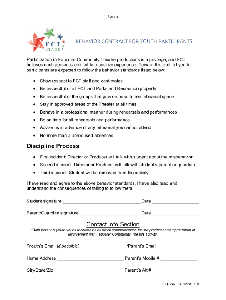 FormsBEHAVIOR CONTRACT FOR YOUTH PARTICIPANTS Participation in Faultier Community Theater productions is a privilege, and ACT believes each person is entitled to a positive experience. Toward this