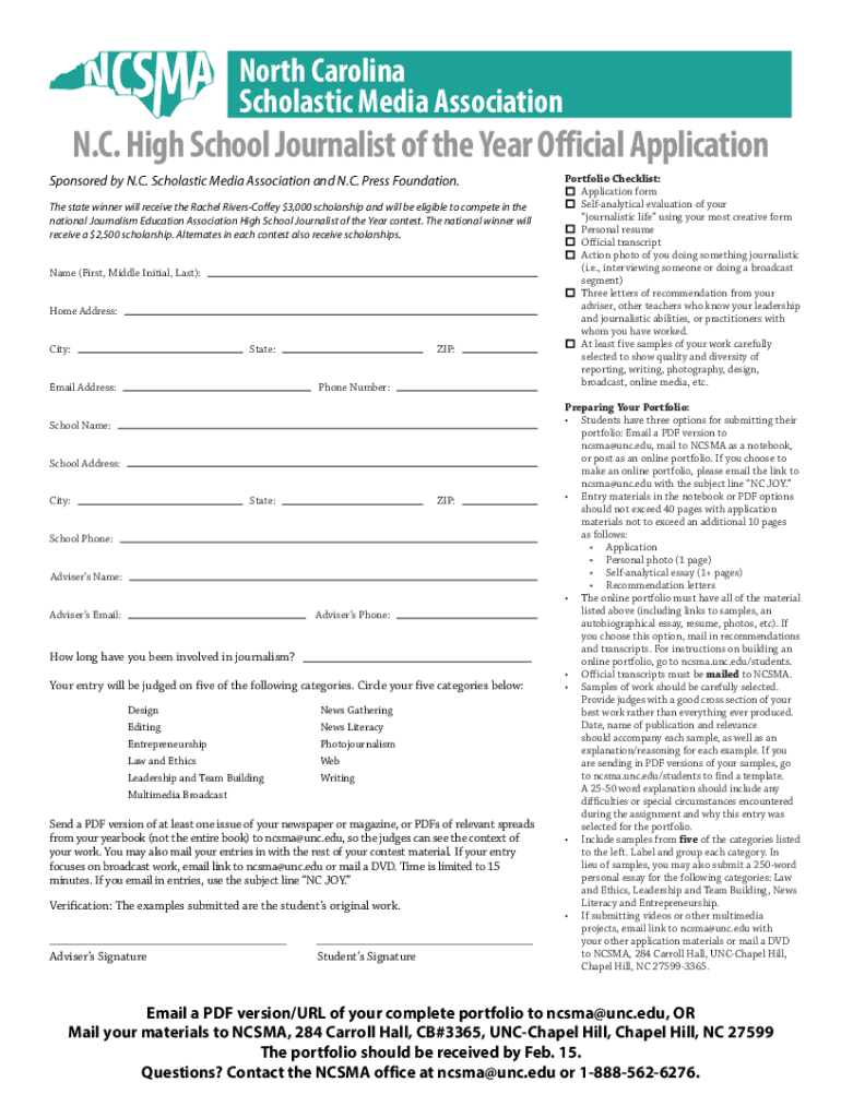 North Carolina Scholastic Media Association. C. High School Journalist of the Year Official Application Sponsored by N.C. Scholastic Media Association and N.C. Press Foundation. The state winner will