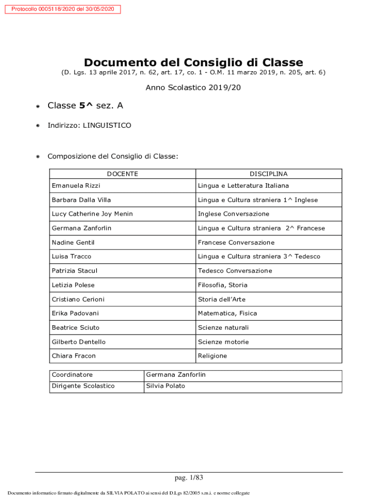 Protocol lo 0005118/2020 Del 30/05/2020Documento Del Consigned DI Class'd. LGS. 13 April 2017, n. 62, art. 17, co. 1 O.M. 11 Mario 2019, n. 205, art. 6)Anna Scholastic 2019/20
