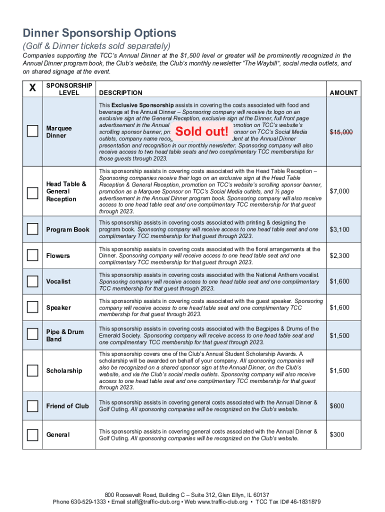 TRAFFIC CLUB OF CHICAGO 114TH ANNUAL DINNER, GOLF OUTING & NETWORKING LUNCH MAY 25 & 26, 2022SPONSORSHIP APPLICATION800 Roosevelt Road, Building C Suite 312, Glen Ellyn, IL 60137 Phone 6305291333