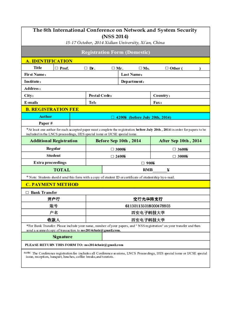 The 8th International Conference on Network and System Security (NSS 2014) 1517 October 2014 Median University, Xi\'an, ChinaRegistration Form (Domestic) A. IDENTIFICATION Prof. Title Dr. Mr. Ms.