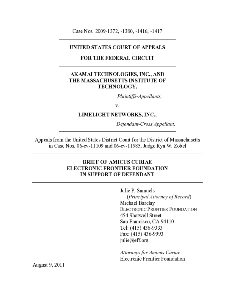 Case Nos. 20091372, 1380, 1416, 1417 UNITED STATES COURT OF APPEALS FOR THE FEDERAL CIRCUIT AKAMAI TECHNOLOGIES, INC., AND THE MASSACHUSETTS INSTITUTE OF TECHNOLOGY, PlaintiffsAppellants, v. LIMELIGHT