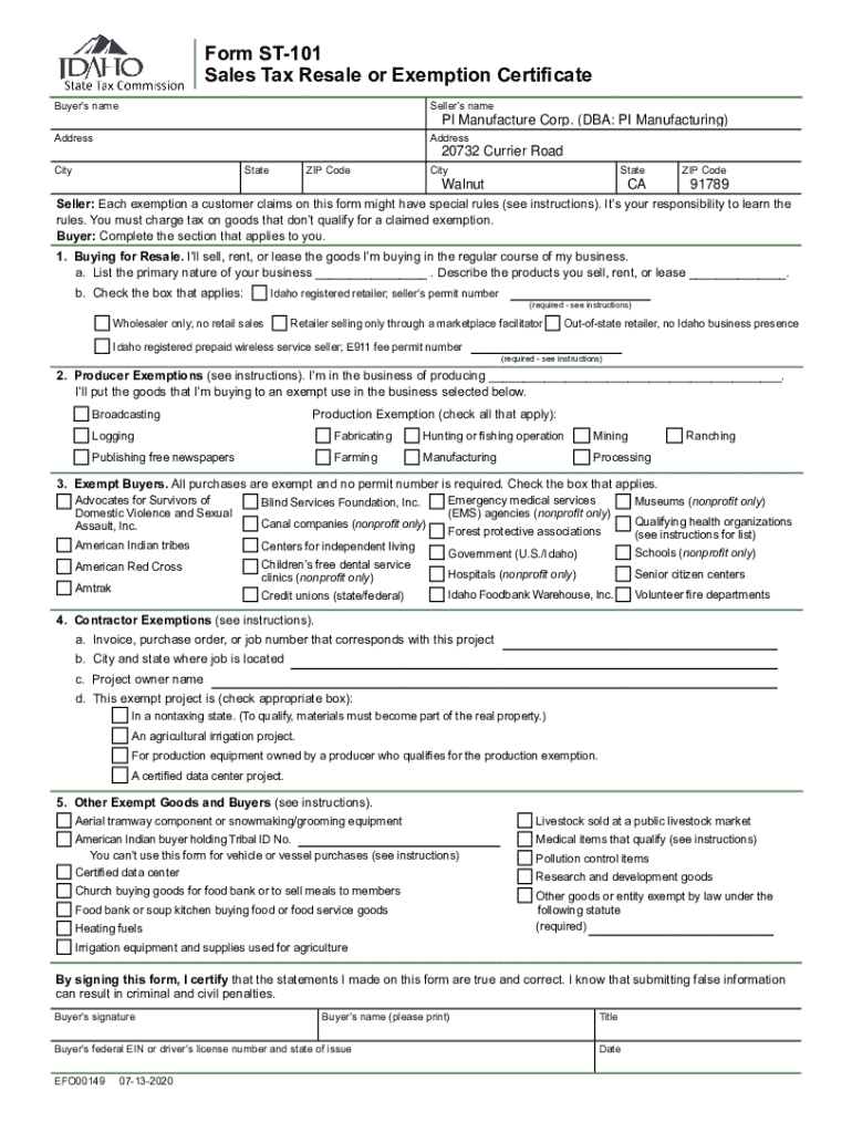 Form ST101 Sales Tax Resale or Exemption Certificate Buyers name Sellers nameAddressAddressPI Manufacture Corp. (DBA: PI Manufacturing) 20732 Currier Road CityStateZIP CodeCityStateZIP CodeCA91789WalnutSeller: