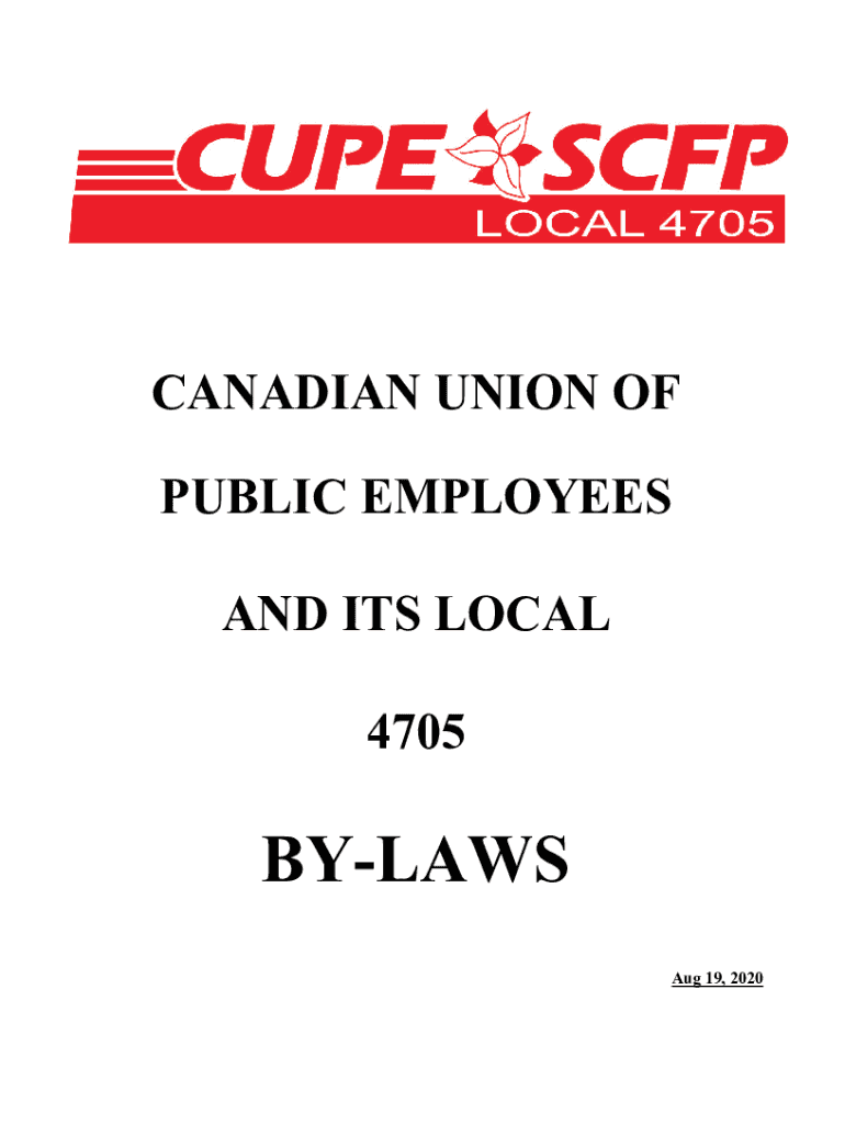 CANADIAN UNION OF PUBLIC EMPLOYEES AND ITS LOCAL 4705BYLAWS Aug 19, 2020Table of Contents LOCAL UNION STRUCTURE PREAMBLE SECTION 1 NAME SECTION 2 OBJECTIVES SECTION 3 INTERPRETATION AND DEFINITIONS
