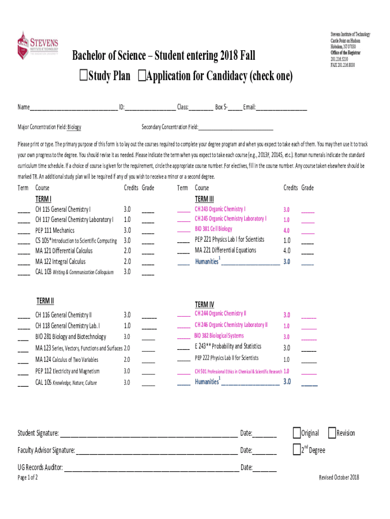 Bachelor of Science Student entering 2018 Fall Study Plan Application for Candidacy (check one) Name___ID:___Class:___BoxS___Email:___ MajorConcentrationField:BiologySecondaryConcentrationField:___Pleaseprintortype.