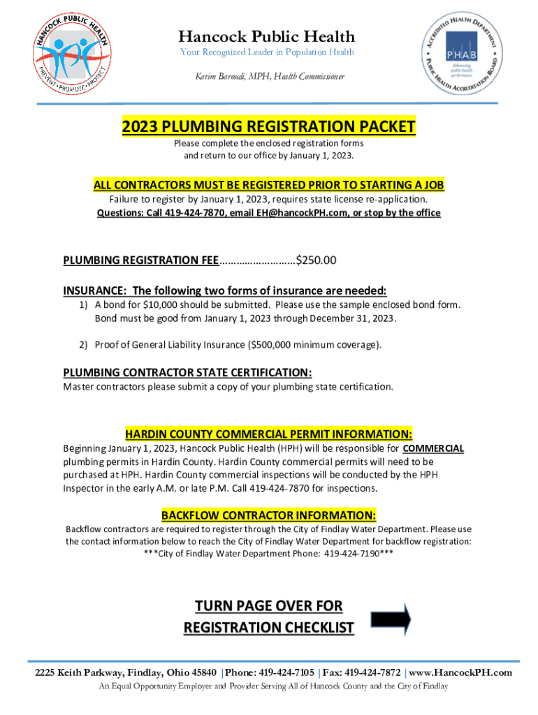 Hancock Public Health Your Recognized Leader in Population Health Karim Barbuda, MPH, Health Commissioner2023 PLUMBING REGISTRATION PACKET Please complete the enclosed registration forms and return