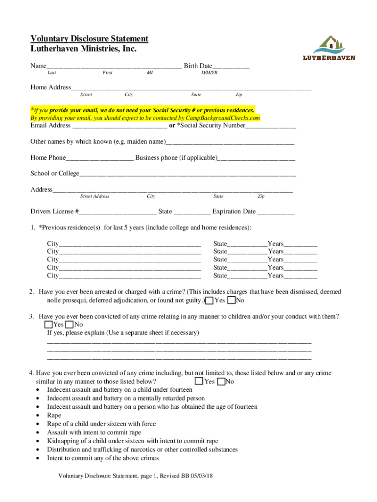 Voluntary Disclosure Statement Luther haven Ministries, Inc. Name___ Birth Date___ LastFirstMID/M/Home Address___ StreetCityStateZip×if you provide your email, we do not need your Social Security