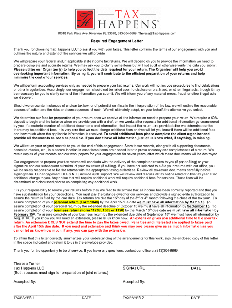 10018 Park Place Ave, Riverview FL 33578, 8133045569, Theresa@TaxHappens.comRequired Engagement Letter Thank you for choosing Tax Happens LLC to assist you with your taxes. This letter confirms the