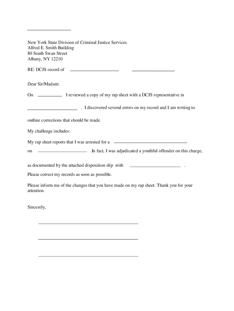(Insert Date)New York State Division of Criminal Justice Services Alfred E. Smith Building 80 South Swan Street Albany, NY 12210 RE: CJS record of (Insert Name)(Insert NY SID)Dear Sir/Madam: On reviewed
