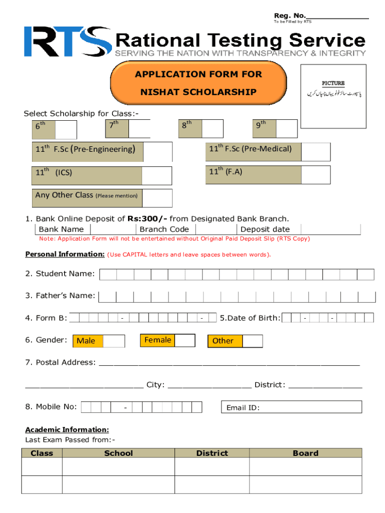 Reg. No.___ To be Filled by MISAPPLICATION FORM FORPICTURENISHAT SCHOLARSHIP Select Scholarship for Class:7th6th9th8th11th F. Sc (Reengineering)11th F. Sc (PreMedical)11th (ICS)11th (F. A)Any Other