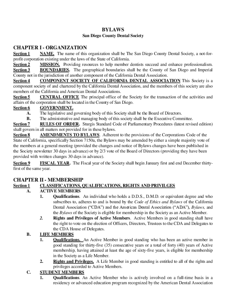 BYLAWS San Diego County Dental SocietyCHAPTER I ORGANIZATION Section 1 NAME. The name of this organization shall be The San Diego County Dental Society, a notforprofit corporation existing under the