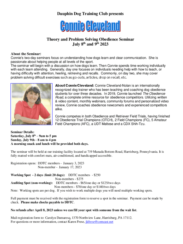Dauphin Dog Training Club presentsTheory and Problem-Solving Obedience Seminar July 8th and 9th 2023 About the Seminar: Connie\'s today seminars focus on understanding how dogs learn and clear communication.