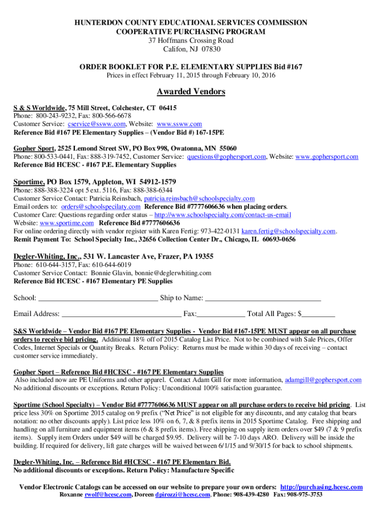 HUNTER DON COUNTY EDUCATIONAL SERVICES COMMISSION COOPERATIVE PURCHASING PROGRAM 37 Hoffmans Crossing Road Calif on, NJ 07830 ORDER BOOKLET FOR P.E. ELEMENTARY SUPPLIES Bid #167 Prices in effect February