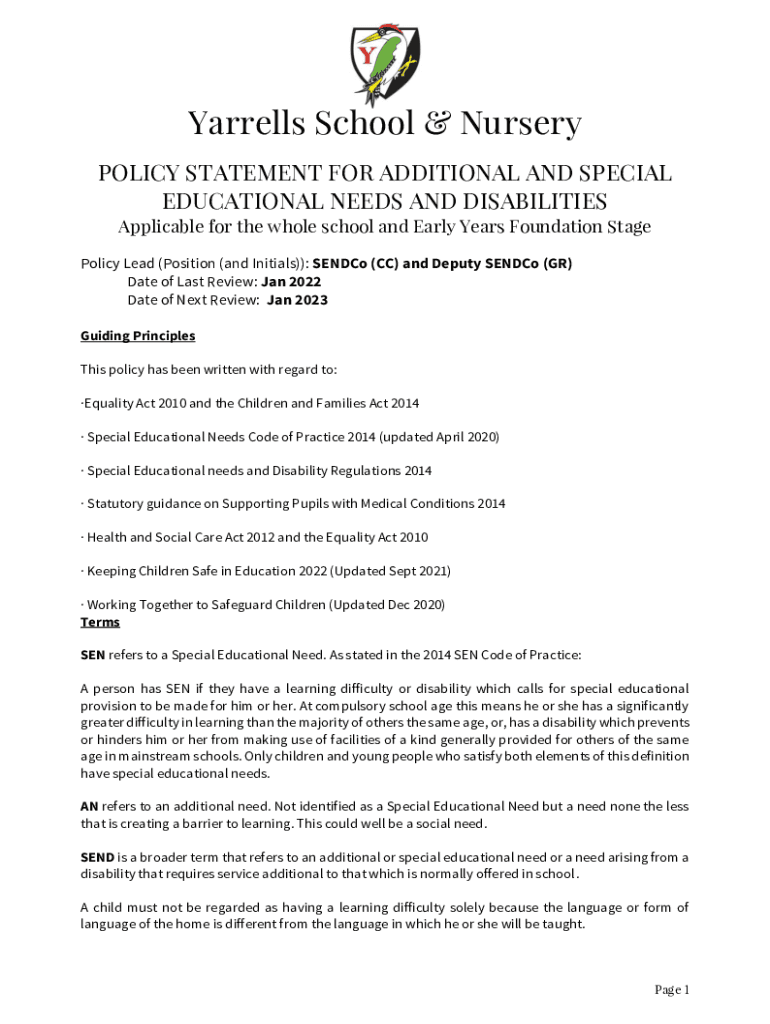 Barrels School & Nursery POLICY STATEMENT FOR ADDITIONAL AND SPECIAL EDUCATIONAL NEEDS AND DISABILITIES Applicable for the whole school and Early Years Foundation StagePolicy Lead (Position (and Initials)):