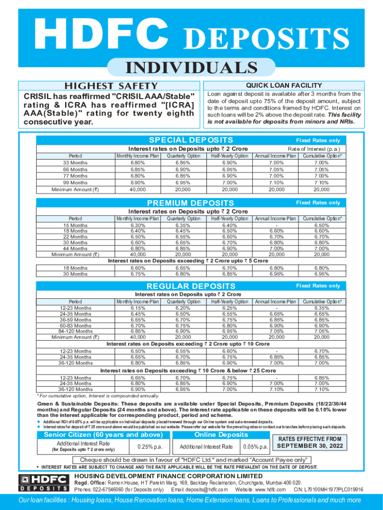 HDFCDEPOSITSINDIVIDUALSHIGHEST SAFETYQUICK LOAN FACILITYCRISIL has reaffirmed \” CRISIS AAA/Stable\” rating & ICRA has reaffirmed \”[ICRA] AAA(Stable)\” rating for twenty-eighth consecutive