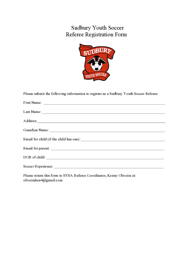Sudbury Youth Soccer Referee Registration Formulas submit the following information to register as a Sudbury Youth Soccer Referee: First Name: Last Name: Address: Guardian Name: Email for child (if