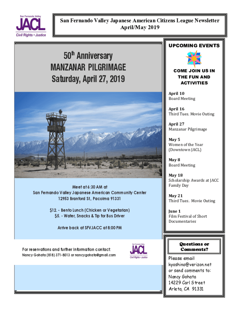 San Fernando Valley Japanese American Citizens League Newsletter April/May 2019 UPCOMING EVENTS50th Anniversary Mañana PILGRIMAGE Saturday, April 27, 2019COME JOIN US IN THE FUN AND ACTIVITIESMeet