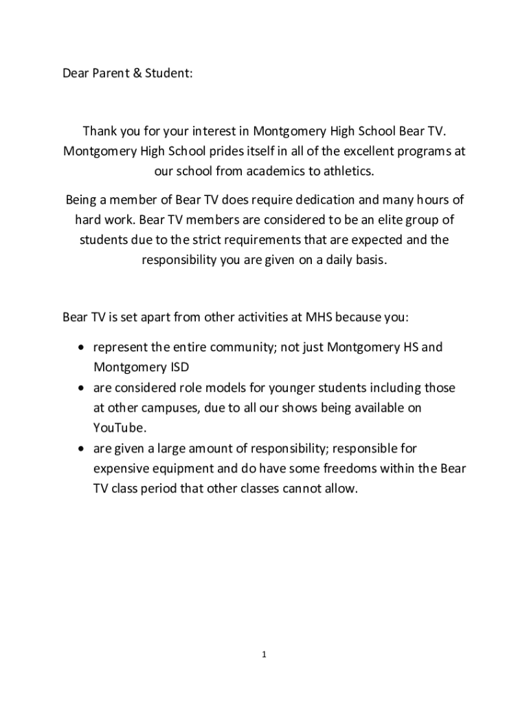 Dear Parent & Student:Thank you for your interest in Montgomery High School Bear TV. Montgomery High School prides itself in all the excellent programs at our school from academics to athletics. Being