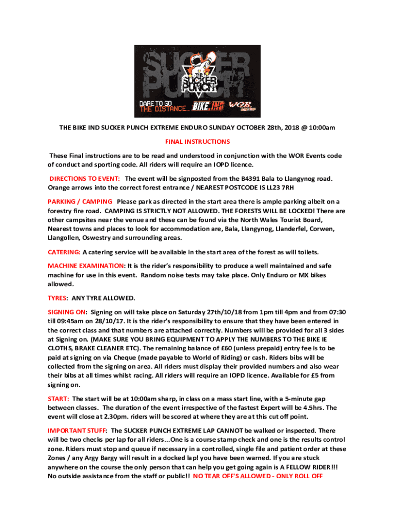 THE BIKE IND SUCKER PUNCH EXTREME ENDURO SUNDAY, OCTOBER 28th, 2018 @ 10:00am FINAL INSTRUCTIONS These Final instructions are to be read and understood in conjunction with the WORE vents code of conduct