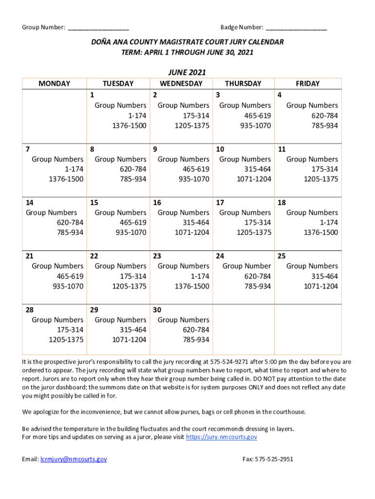 Group Number: ___Badge Number: ___DOA ANA COUNTY MAGISTRATE COURT JURY CALENDAR TERM: APRIL 1 THROUGH JUNE 30, 2021JUNE 2021 MONDAYTUESDAY 1WEDNESDAY8 Group Numbers 1174 13761500Group Numbers 620784
