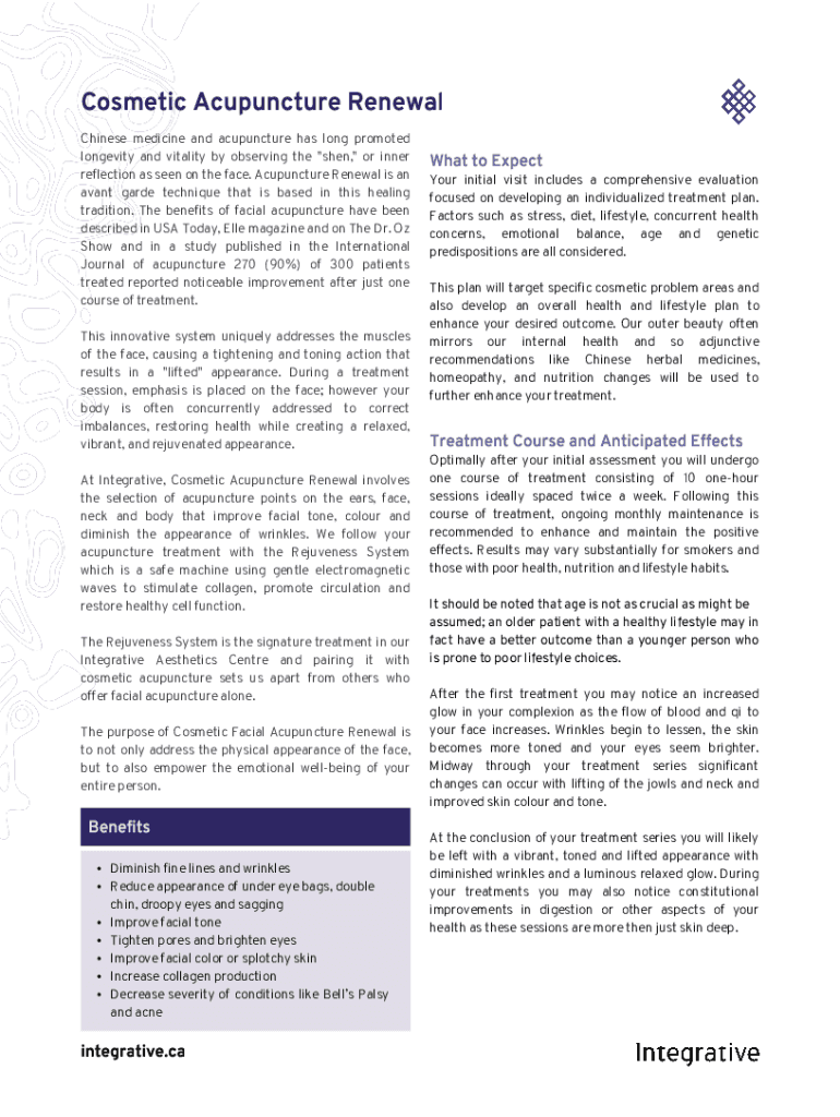 Cosmetic Acupuncture Renewal Chinese medicine and acupuncture has long promoted longevity and vitality by observing the \” she, \” or inner reflection as seen on the face. Acupuncture Renewal