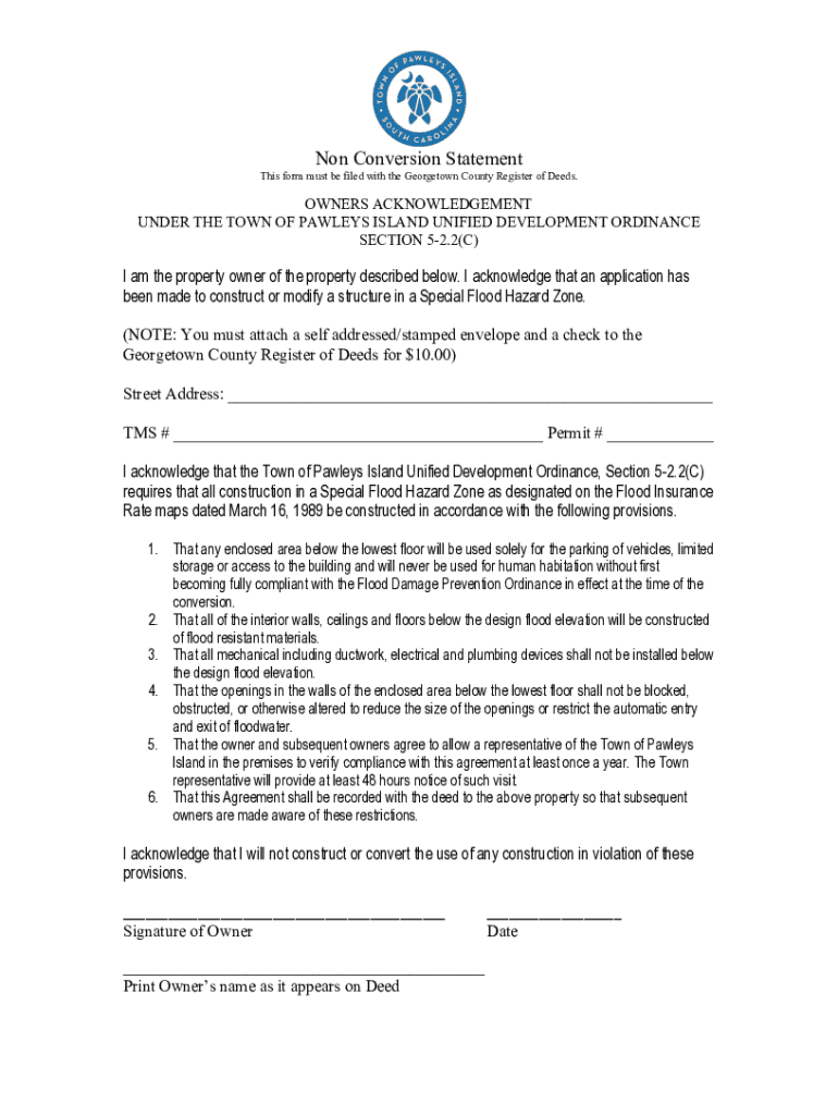 Non Conversion Statement This form must be filed with the Georgetown County Register of Deeds. OWNERS ACKNOWLEDGEMENT UNDER THE TOWN OF PARLEYS ISLAND UNIFIED DEVELOPMENT ORDINANCE SECTION 52.2(C)I