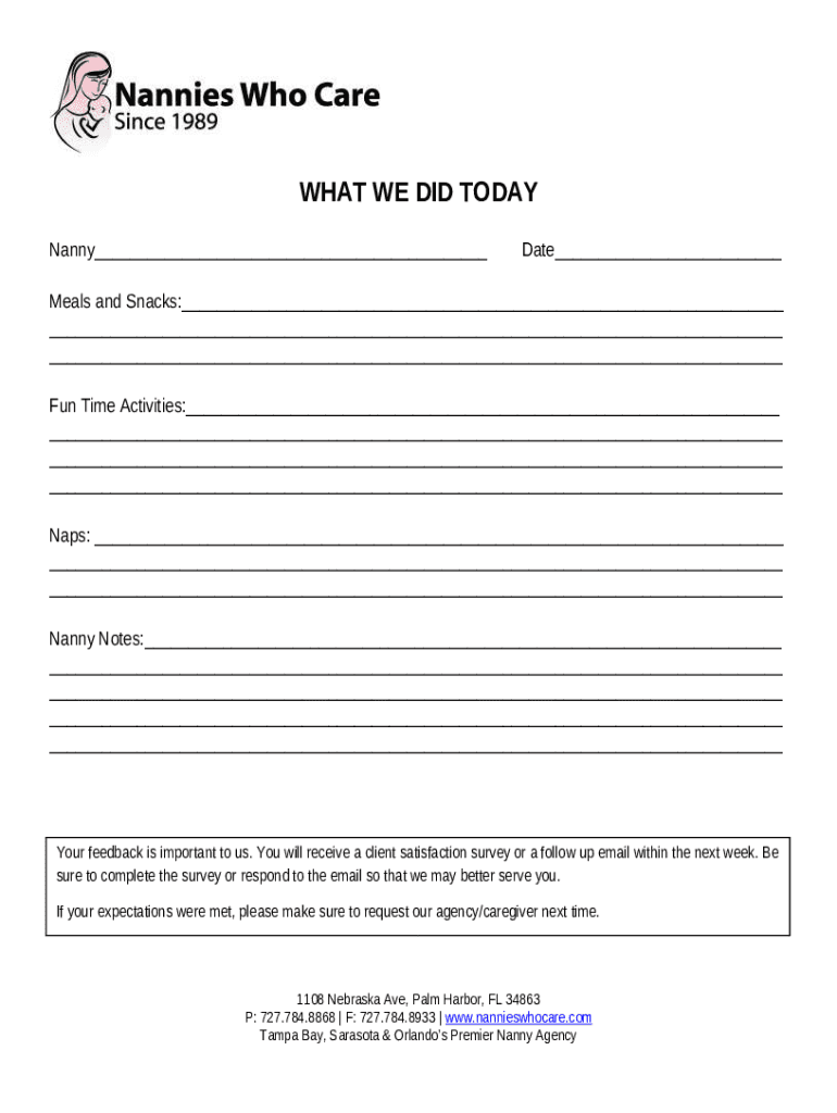 WHAT WE DID TODAY Nanny___Date___Meals and Snacks:___ ___ ___ Fun Time Activities:___ ___ ___ ___ Naps: ___ ___ ___ Nanny Notes:___ ___ ___ ___ ___Your feedback is important to us. You will receive